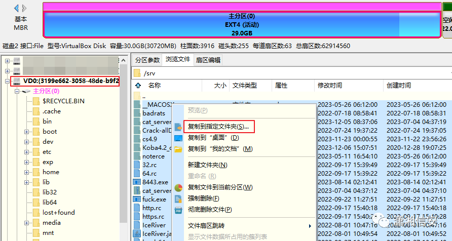 打开了快照VDI磁盘文件,找到需要备份的文件,点右键“复制到指定文件夹”备份即可,如下图所示。