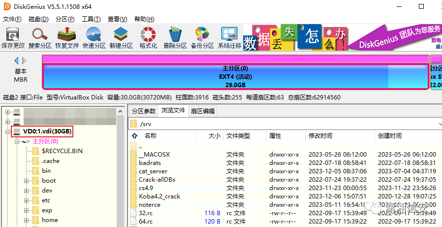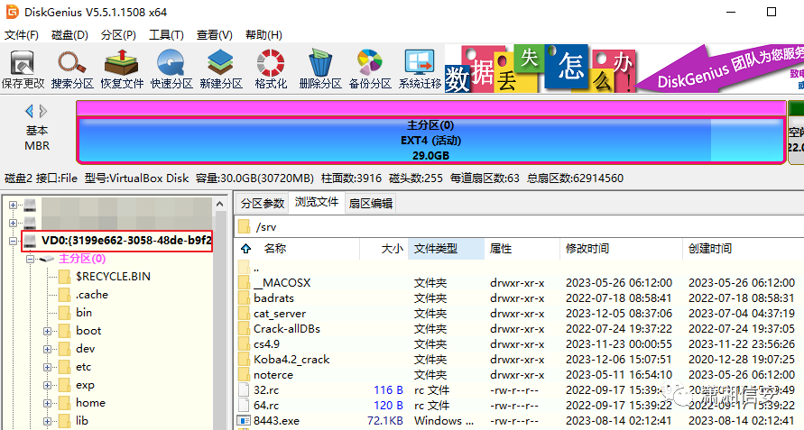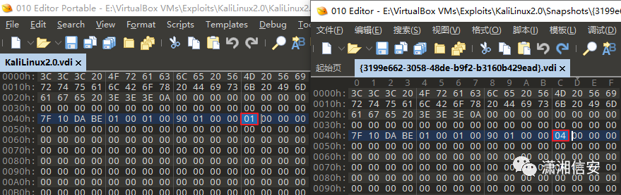 还找到一个更快捷的办法,010 editor分别打开基础磁盘文件、快照VDI磁盘文件,16进制中发现有一处不同,将04改为01后就可以用DiskGenius打开了,如下图所示。
