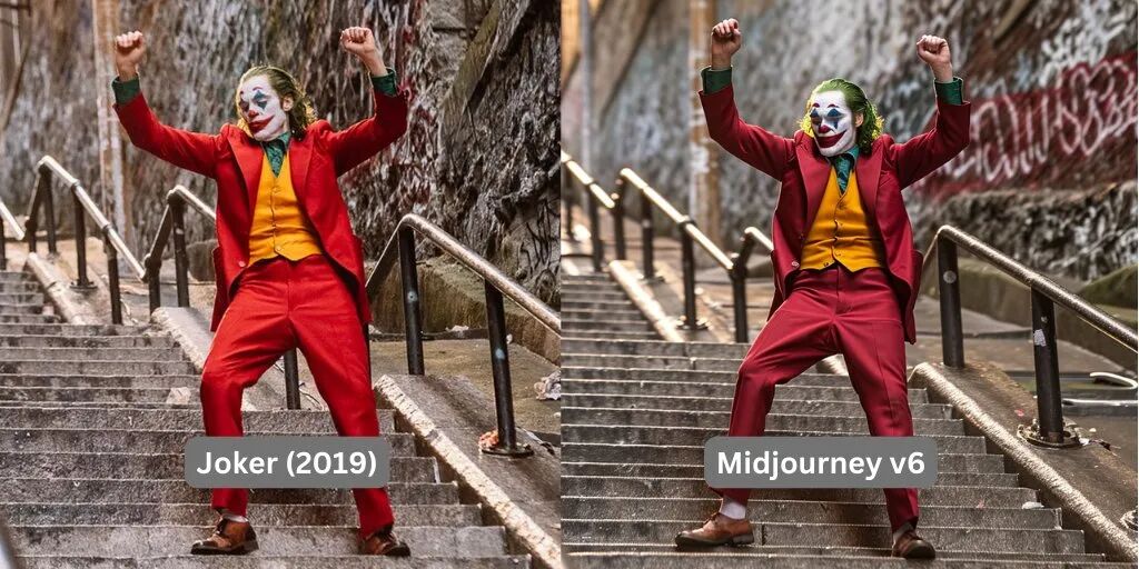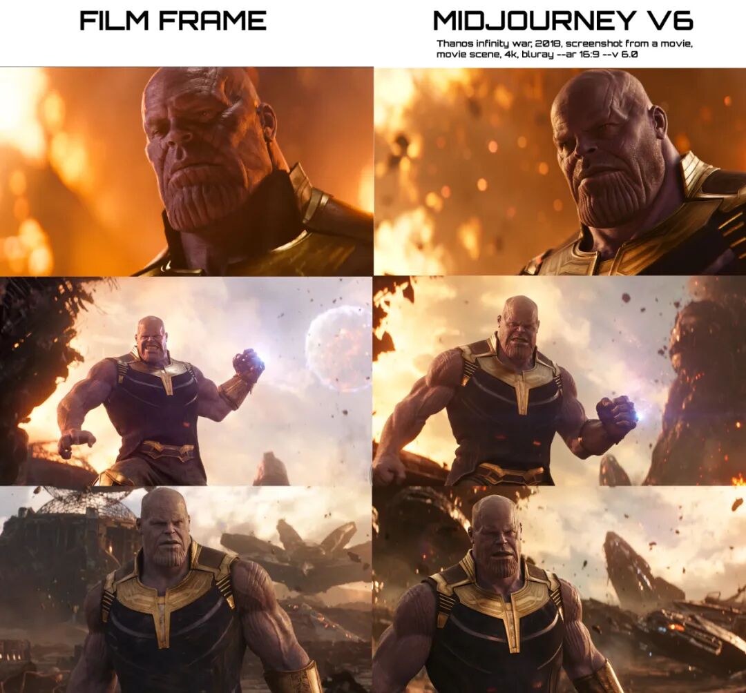 前几天,AI 绘画工具 Midjourney 推出了 V6 版本,随后一如既往的赢得了进步巨大的盛赞。V6 模型的最大亮点,在于它对画面真实性的理解更加透彻了,无论是在细节的处理上,还是对于提示词的敏感,相比 V5.2 都有着前所未有的提升。但在另一方面,随着被使用规模的增加,越来越多的人发现,Midjourney V6 之所以能够拿出极其逼真的图画,可能是因为它的训练来源已经深入到了影视作品的每一帧上,而且并不掩饰生图时的一致性。有很多用户已经发现了拟合度非常高的案例,比如下面这组对比,左边是「复仇者联盟」的电影截图,右边是 Midjourney V6 的出图: