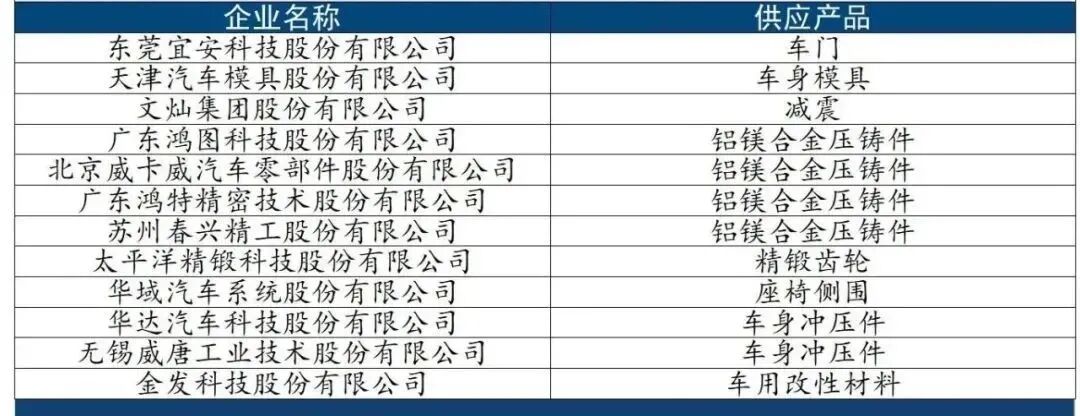 国内共有12家供应商为特斯拉车身供应相关材料及组件。