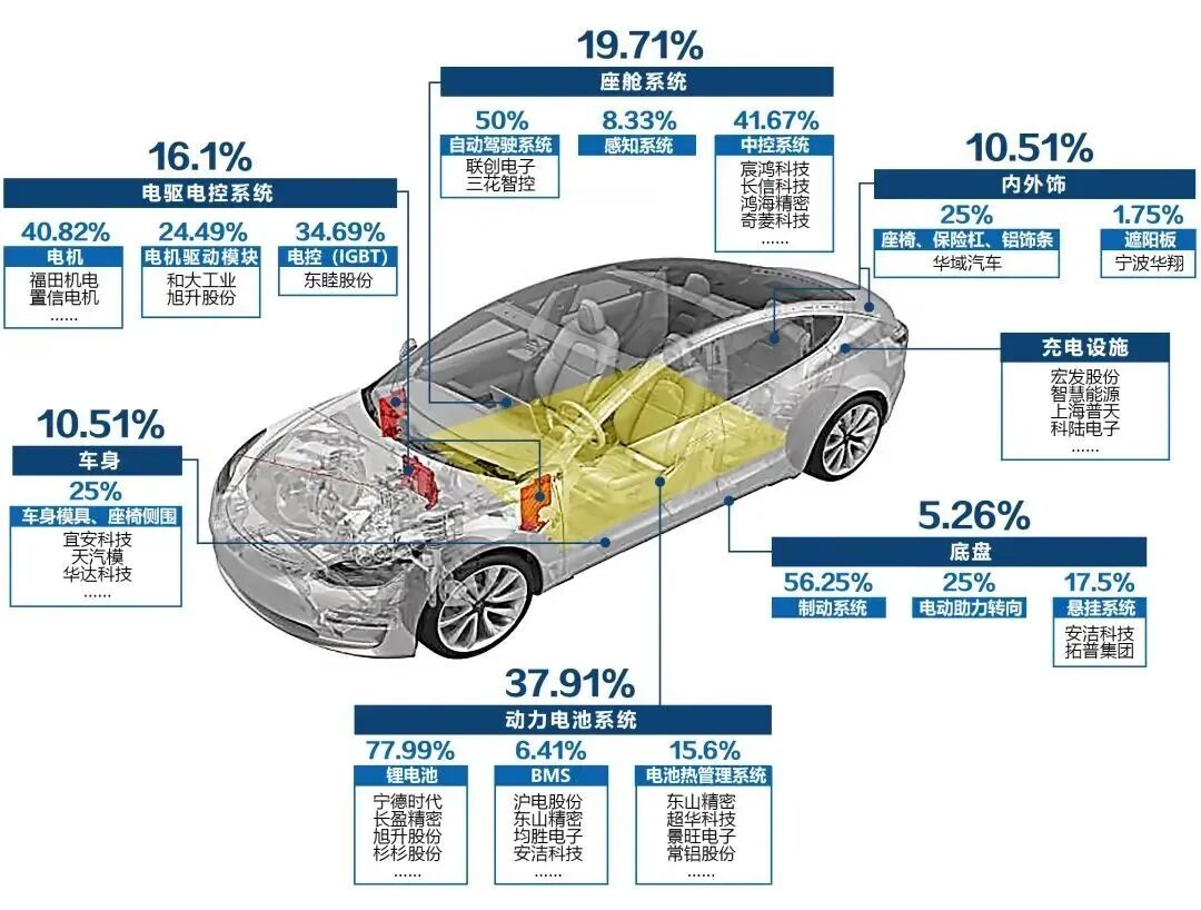 特斯拉model3价值占比及国内核心供应商企业全景图