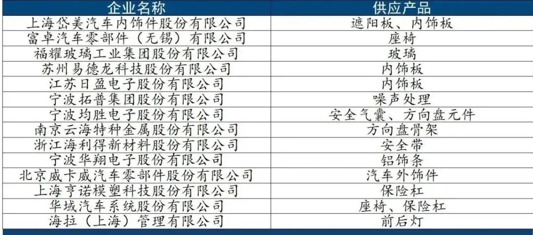 国内共有10家供应商为特斯拉内饰供应相关材料及组件。