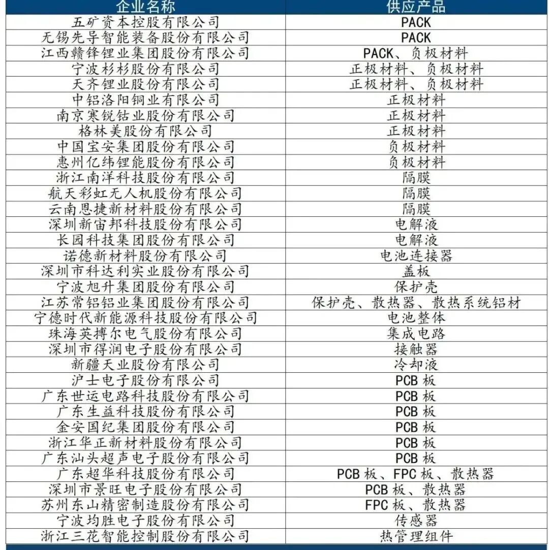 从企业能级来看,102家供应商中,上市公司共有93家,占比超90%;台资企业5家;国家高新技术企业2家;上市公司子公司1家;国家特大型骨干企业1家。