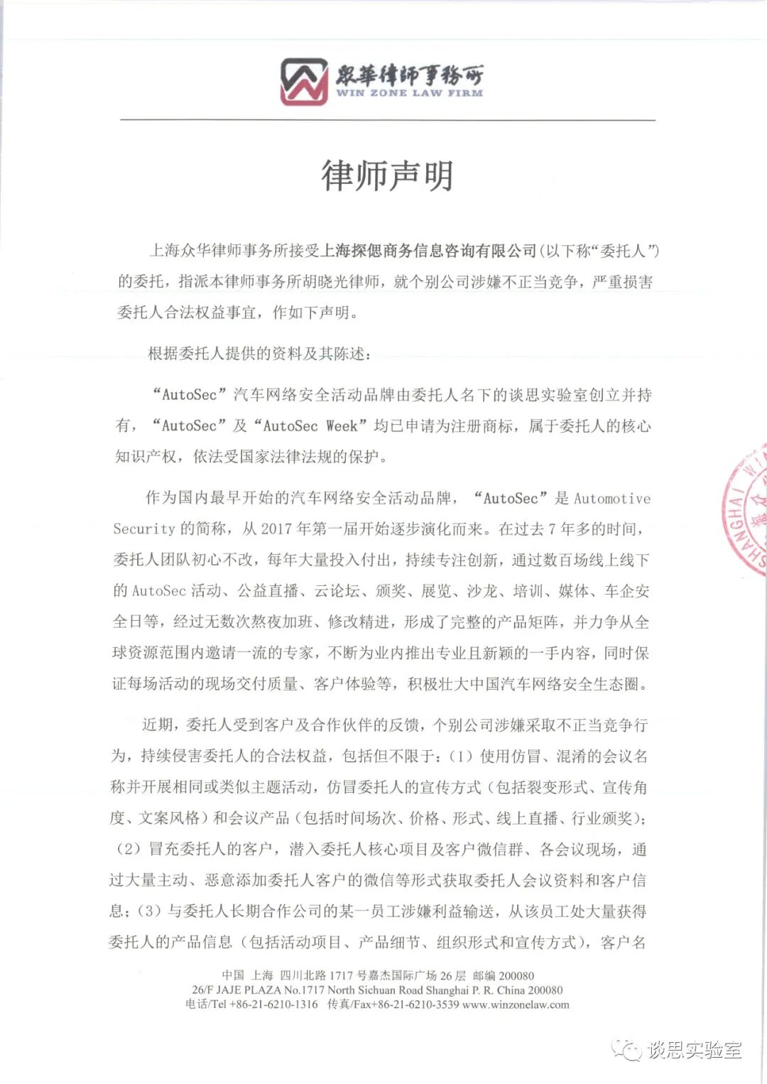 “AutoSec”汽车网络安全活动品牌由委托人名下的谈思实验室创立并持有,“AutoSec”及“AutoSec Week”均已申请为注册商标,属于委托人的核心知识产权,依法受国家法律法规的保护。