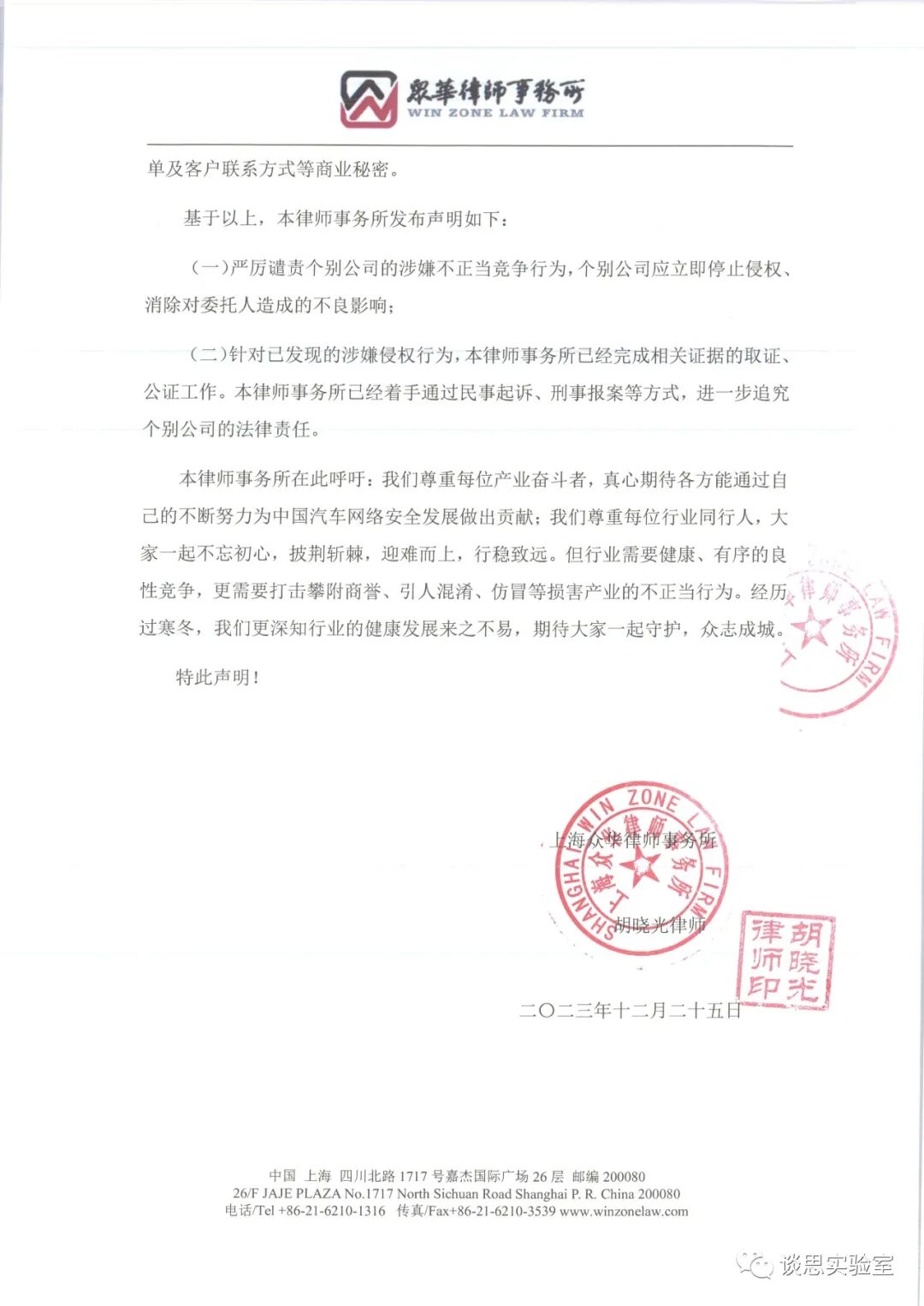 本律师事务所在此呼吁:我们尊重每位产业奋斗者,真心期待各方能通过自己的不断努力为中国汽车网络安全发展做出贡献;我们尊重每位行业同行人,大家一起不忘初心,披荆斩棘,迎难而上,行稳致远。但行业需要健康、有序的良性竞争,更需要打击攀附商誉、引人混淆、仿冒等损害产业的不正当行为。经历过寒冬,我们更深知行业的健康发展来之不易,期待大家一起守护,众志成城。