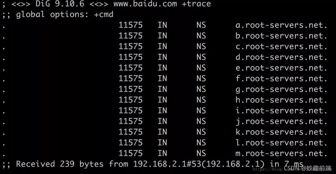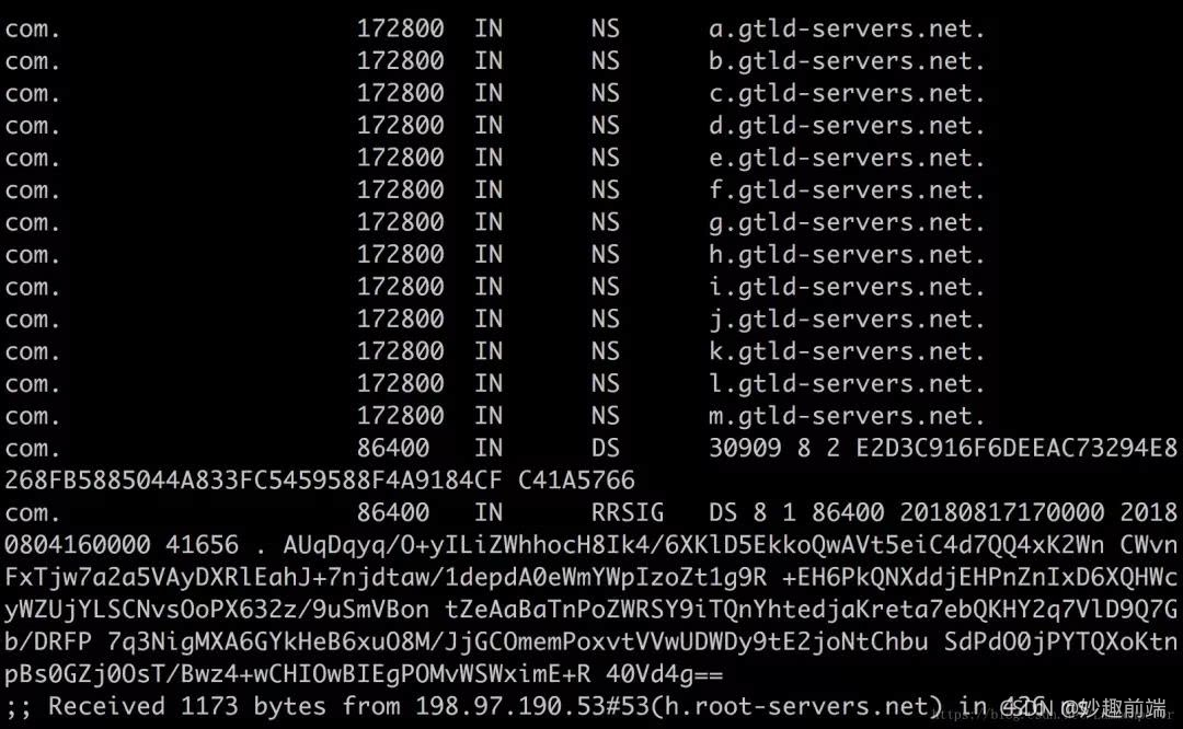 第二步:从个根域名服务器中的其中一个(这里是)获取到顶级的服务器(未显示)和名称。