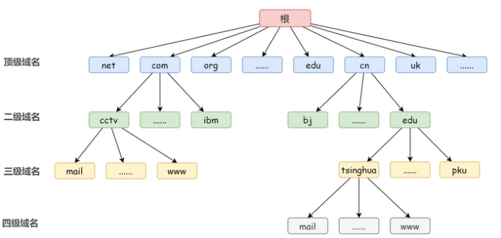 域名是一个具有层次的结构,从上到下一次为根域名、顶级域名、二级域名、三级域名…