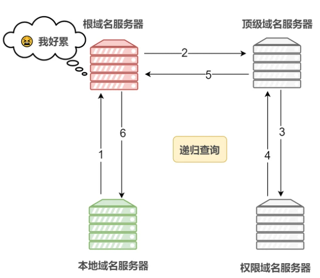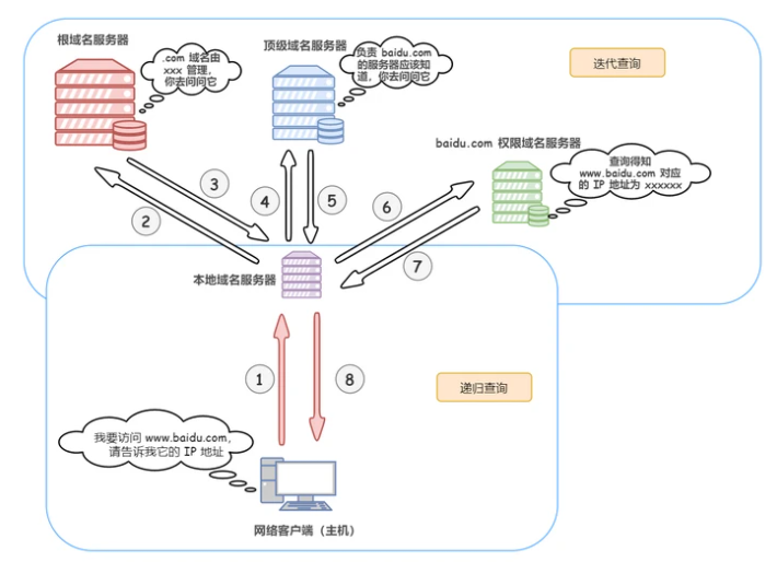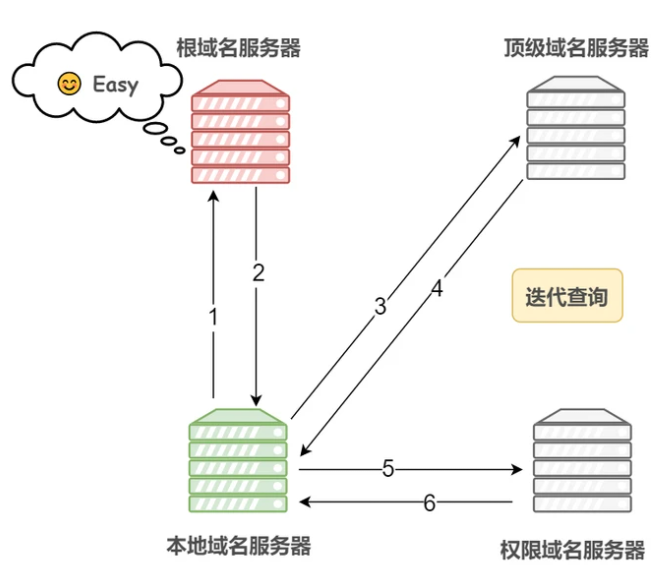 迭代查询:如果接收者 B 没有请求者 A 所需要的准确内容,接收者 B 将告诉请求者 A,如何去获得这个内容,但是自己并不去发出请求 。