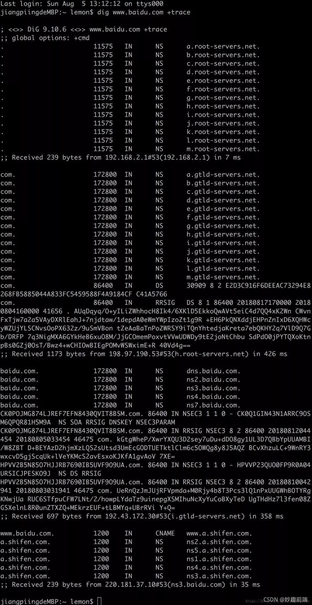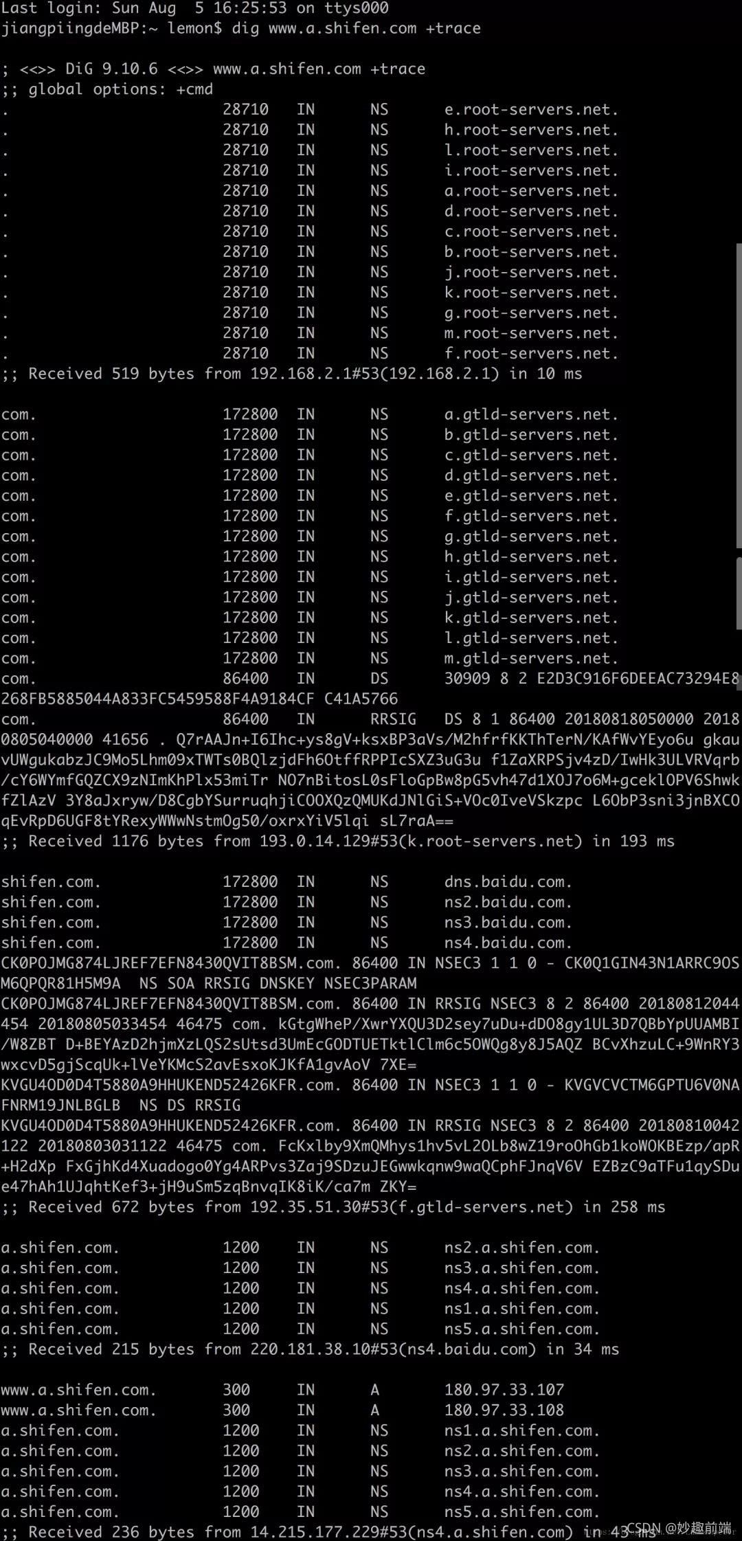 这时候看到最后的解析结果是a.shifen.com.。在解析别名的过程中,可以发现和都是指定了相同的域名解析服务器。以上是一个域名的解析过程,最后的解析结果和一开始的使用的结果一致。