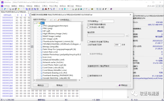 JPEG 文件头为 \xFF\xD8\xFF,我们利用 Winhex 工具自带的文件签名批量检索功能进行查找: