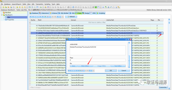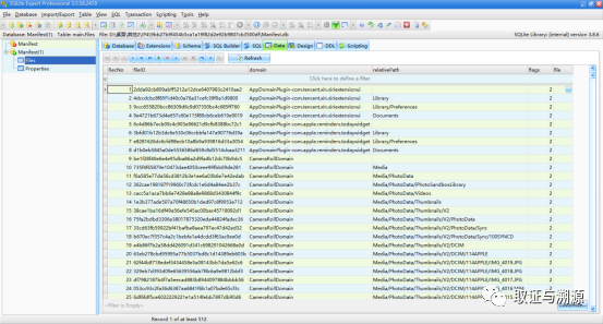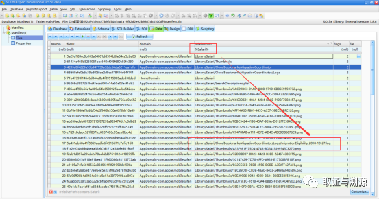 当然上面说的只是一句玩笑话,所有的文件夹名称都保存在根目录下的 “ Manifest.db ” 这个数据库中,我们使用Sqlite工具打开它(Android和iOS绝大数都采用的sqlite数据库):