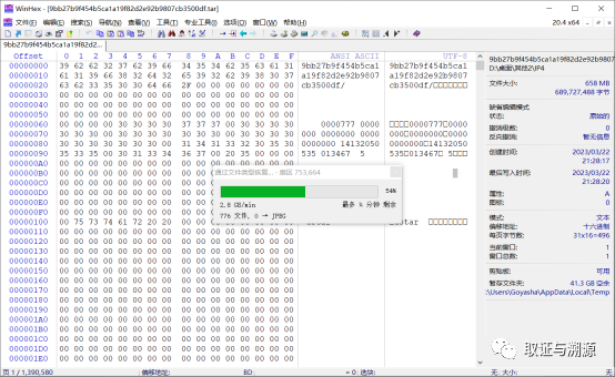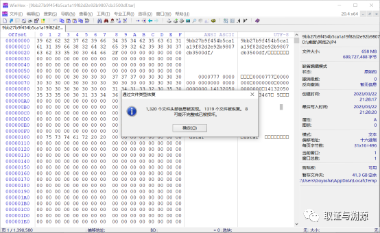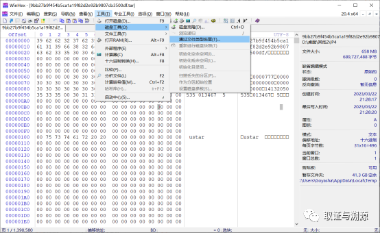 注意!一定要是tar包,如果你拖进去的是 zip、7z 等进行过压缩的包,可能检索不出来。如果是压缩过的数据,先解压再重新打tar包,在用 WinHex 工具解析。
