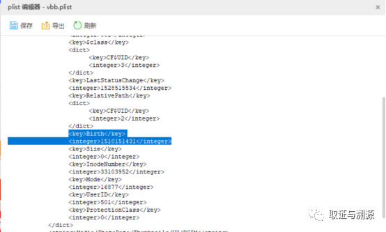 我们定位到 <key>Birth</key> 或其他的都可以,下面的值为 1510151431,10位数字标准的Unix时间戳格式,我们可以去时间戳转换网站或者工具进行解析。