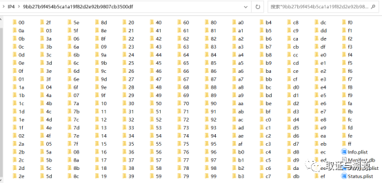注意!别忘了中间还有一个“ – ”减号,少了计算的 Hash 可是错误的。我们拿上面合并好的值做 SHA1 加密,再取前两位就是 iTunes 备份包下文件夹的名称了。我们到里面一层再看看有什么?