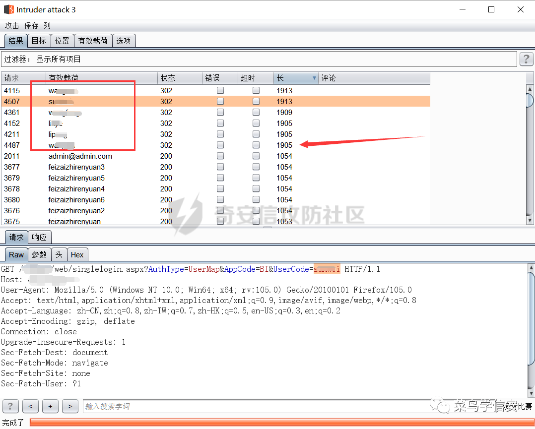 提示该用户没有关联GS用户,验证了我们的猜测。然后抓包遍历用户名,发现有几个302重定向跳转了:然后在UserCode参数后面加上遍历出来的用户名。(这里不使用真实用户名)wsh