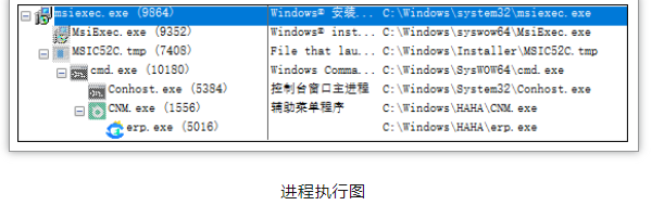 以 "企业补贴政策名单.msi" 为例,用户点击该 msi 文件进行安装后其会执行一系列相关进程,主要是CNM.exe 和 erp.exe。不得不说这个名字起的CNM, 和之前某脚本小子搞的骂人勒索病毒有异曲同工之妙。