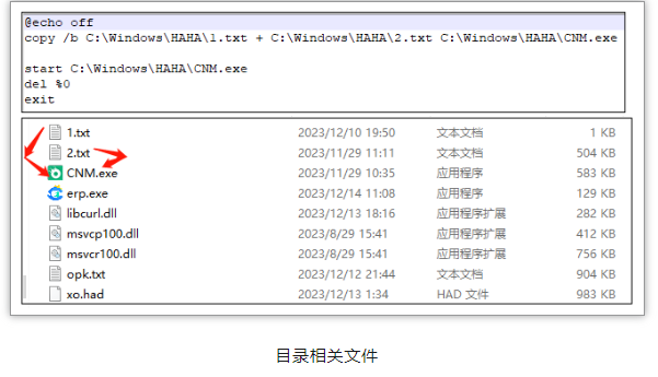 病毒会在"C:\Windows\HAHA" 目录下,创建多个文件。 "1.txt" 和 "2.txt" 是 "CNM.exe" 的前身,是一个文件头和主体分离的 16 进制文本(分离用于免杀操作)。样本会通过 bat 文件进行拼接,并继续执行拼接后的 "exe" 文件。