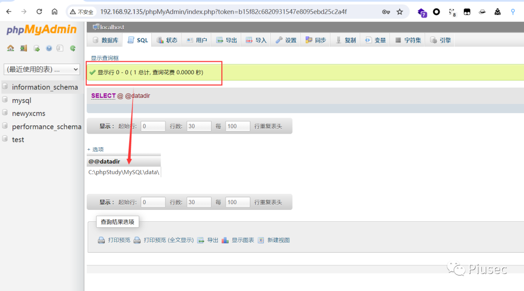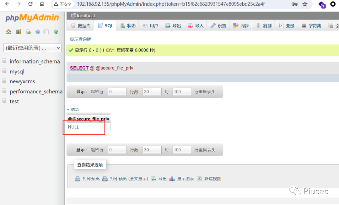 我们查看secure_file_priv是否为NULL,如果是NULL则无法创建文件