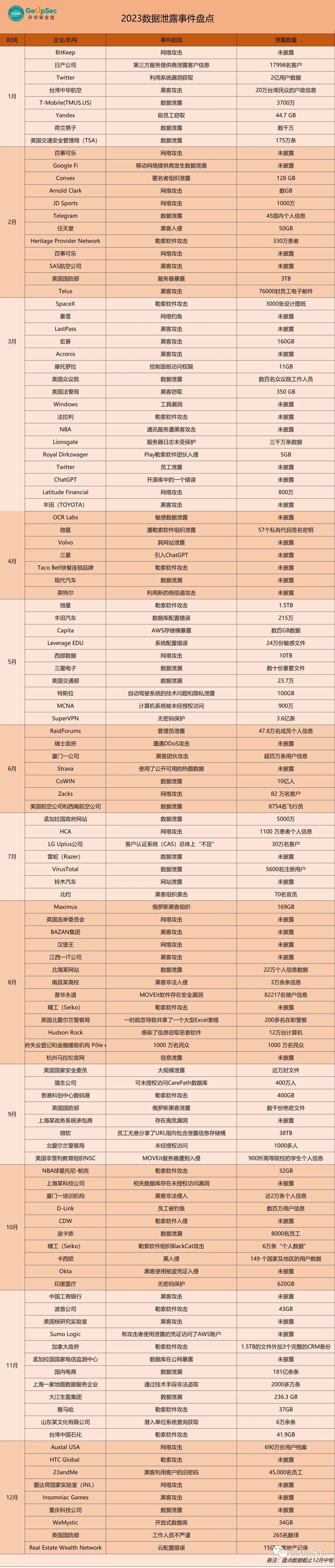 GoUpSec深入统计分析了2023年全球各地数据泄露事件,其中政府部门、科技公司、数码产品生产商、汽车制造商、学校、手机制造商、医疗机构、门户网站、银行业、航空公司等十大行业已成为数据泄露重灾区,GoUpSec根据受影响的企业/机构主体、事件原因、泄露数据数量等方面对发生在或者查明在2023年世界各地发生的重大数据泄露事件按照发生时间进行了收集整理。希望网络安全工作者以史为鉴、开创未来,埋头苦干、勇毅前行!