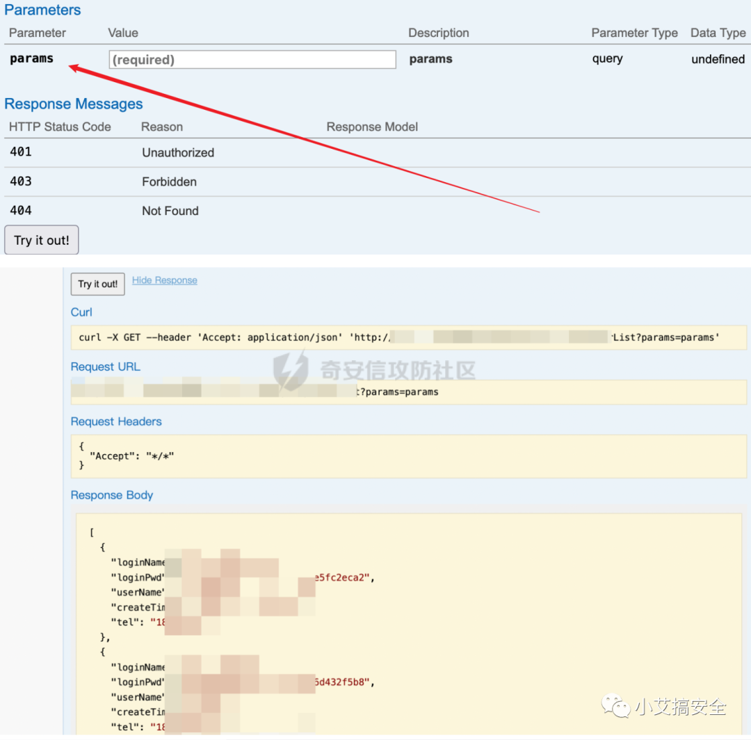 利用Swagger UI的测试功能,能够直接进行测试。存在必须参数时,也可以输入任意字符进行测试,系统可能存在逻辑漏洞。
