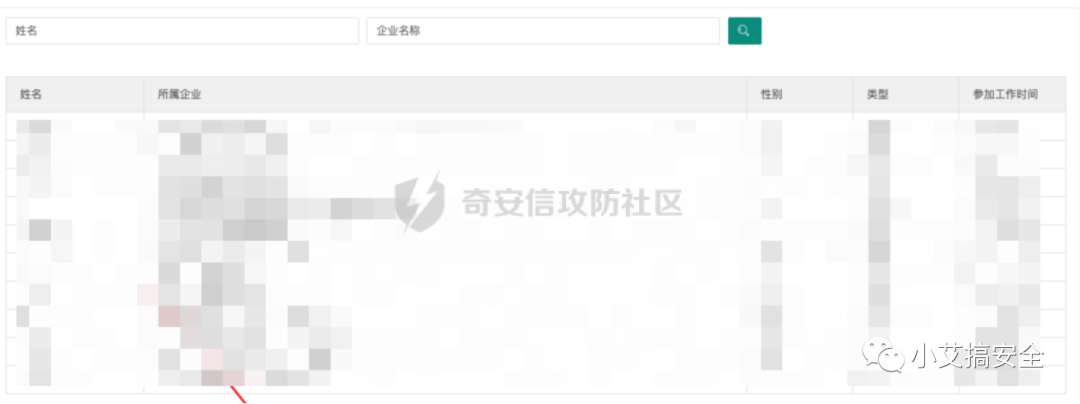 案例1、前端页面仅有姓名、企业、性别、类型、参加工作时间5个字段