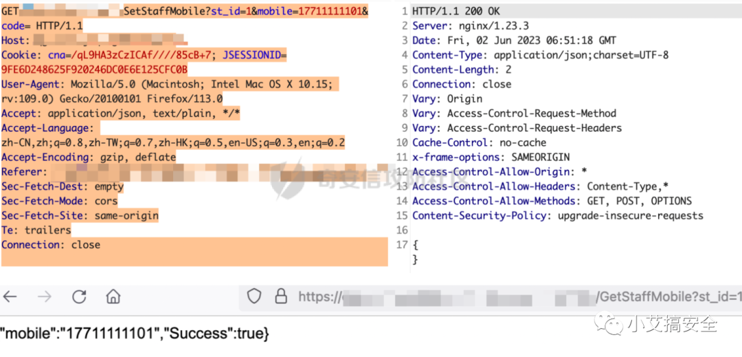 对API进行fuzz猜解,找到了名为SetStaffMobile接口,再对参数进行fuzz,找到了手机号的参数mobile,允许未经授权的用户可更改任意用户的手机号,然后根据手机号验证码登录系统后台,本质上是个未授权访问漏洞,但由于接口的易被猜解所以放在这一单元。后面反馈给研发后,经查证为已知漏洞,API已被废弃,但接口未下架仍然运行在程序上。
