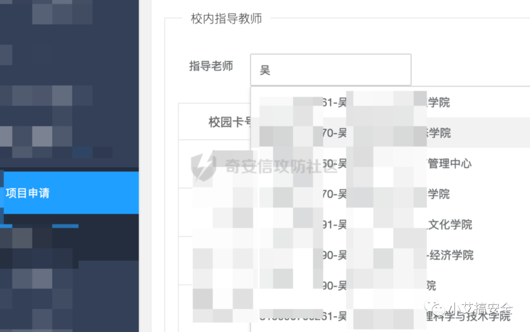 案例3、边缘功能处,选择指导老师,模糊搜索可出现姓名、学号、学院
