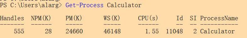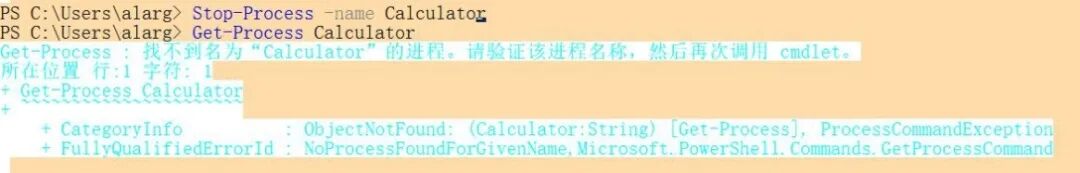 Get-Process -Name Calculator如果存在Calculator进程,则列出;如果不存在,则报错,如图所示。
