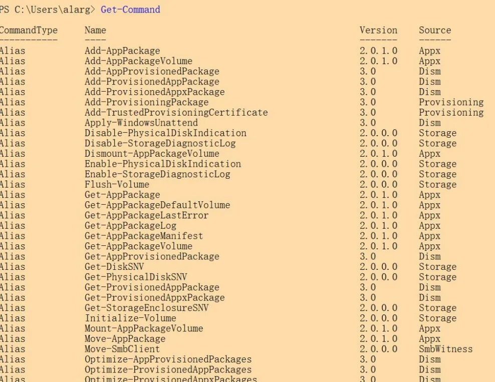 Get-Command命令可以一键列出PowerShell支持的所有命令,同时能按照关键词缩小命令的查找范围,如图所示。