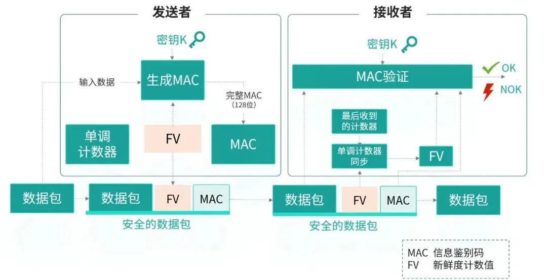 SecOC利用消息授权码和新鲜值为车载通信报文提供安全验证,能有效防御重放、篡改攻击,为车内安全通信数据提供真实性、完整性和时效性保护。SecOC主要采用消息授权码与新鲜值机制: