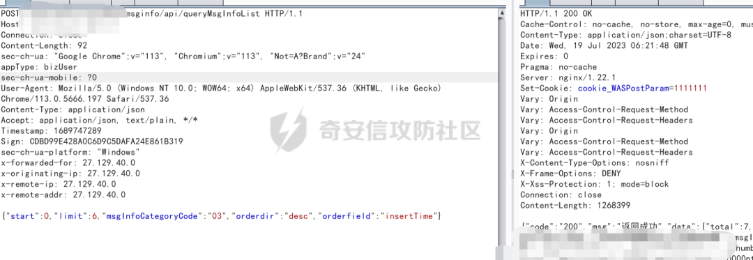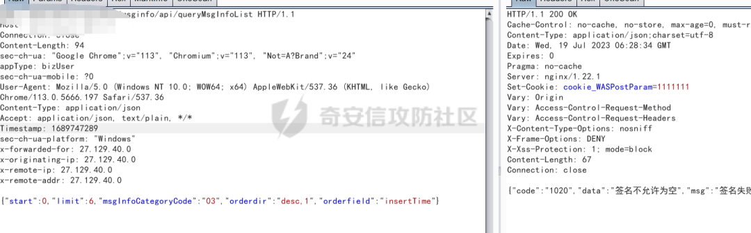 验签了,碰到验签,按经验来说,盲猜是sign这个头。Fuzz一下,Sign去掉后报错,不能为空!