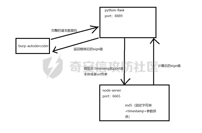 我的目的是:burp-repeater 模块重放数据包,因为我要修改里面的参数,所以每次修改完之后,必须要重新计算sign值。接下来就是构思下数据流程:python启动一个flask,相当于一个web服务,作用是拆解出 我所需要的 timestamp 和 post请求体(或者url的传参);并且会把参数发给node服务,node服务返回计算结果,python程序替换sign值。Node启动一个web服务,计算这个sign值。
