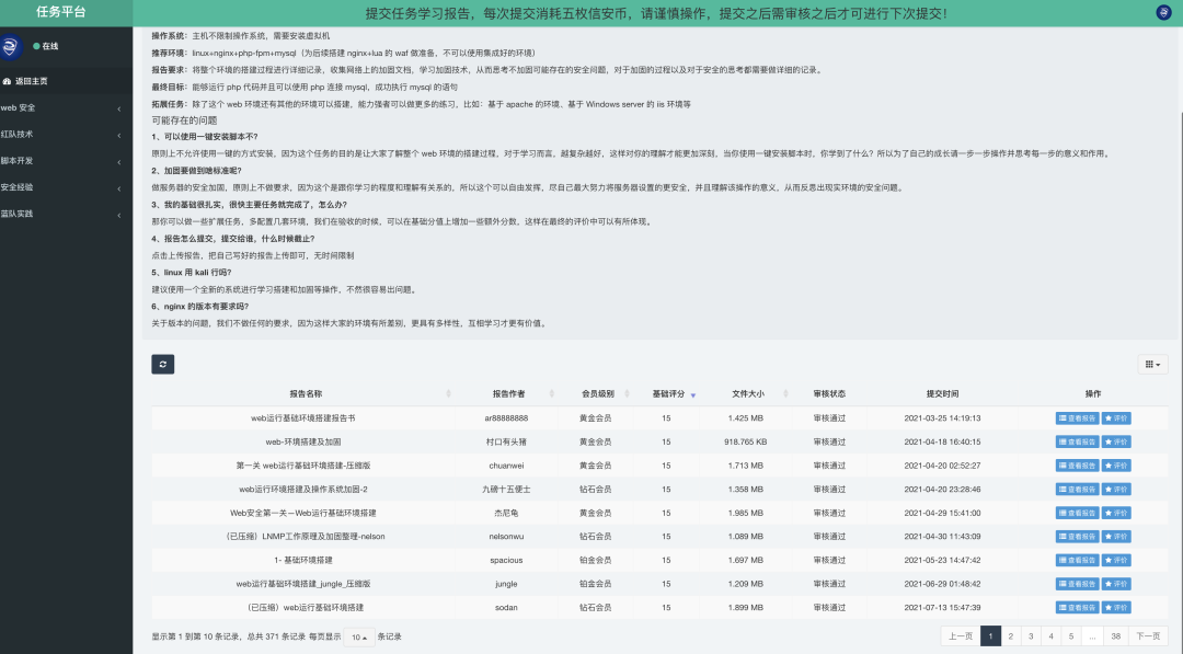4、没落的信安之路成长平台,学习是件难以坚持的事情,成长平台是一个自学的辅助平台,需要参与者编写学习报告,从而沉淀知识技能。