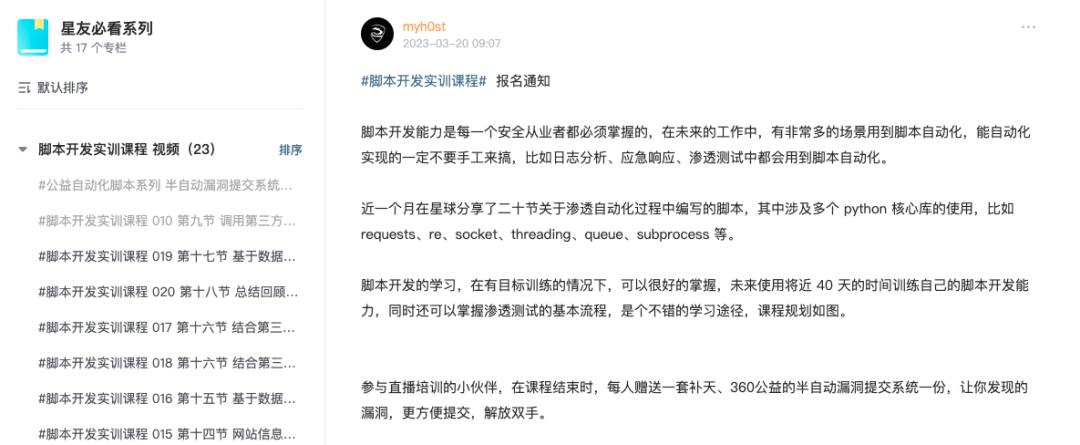 5、知识星球还在持续更新状态,确实分享的内容过于单一,毕竟时间精力有限,可以分享的也就是自己在实践过程中的研究成果。今年新建了一个专门聊渗透的圈子,目的是为了方便注册成长平台,去学习做任务,既有星球看,又能自己基于任务目标自己沉淀,相比之前 128 单注册平台更有优势,目前定位: