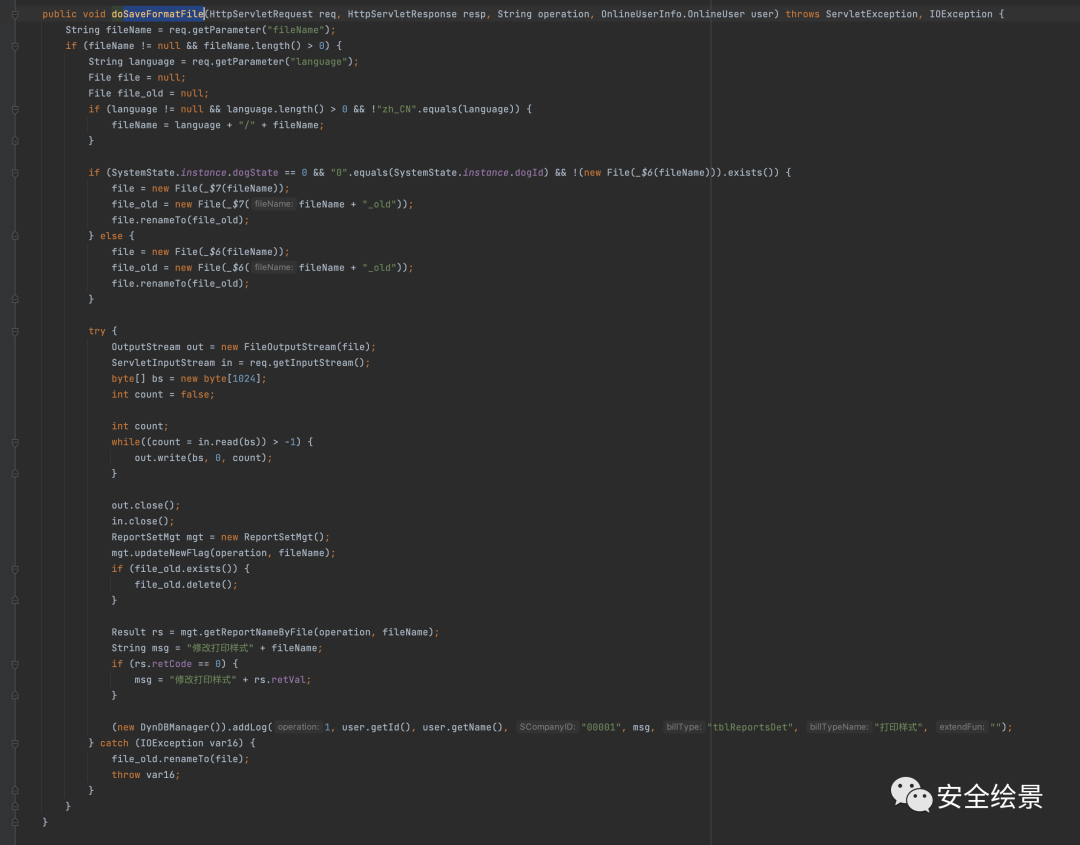 代码很直接获取POST输入流将内容写到指定fileName中,由于fileName未进行过滤导致可以进行越级上传。