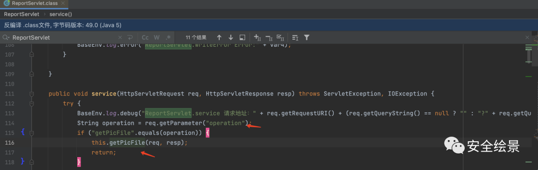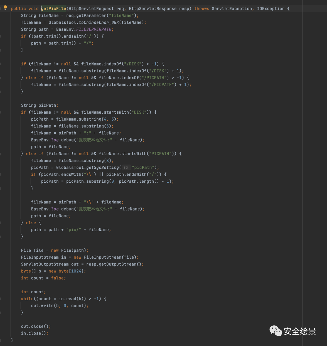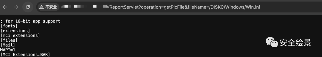 http://xxxxx/ReportServlet?operation=getPicFile&fileName=/DISKC/Windows/Win.ini当operation的值为getPicFile,将传入的fileName参数值进行判断是否以"/DISK"开头并且不为空,如果不为空并以"/DISK"开头进行截取如:/DISKC/Windows/Win.ini ==>DISKC/Windows/Win.ini,接着判断是否"DISK"开头,如果不为空并以"DISK"开头又进行截取然后拼接: 如DISKC/Windows/Win.ini==>C:/Windows/Win.ini最后进行文件读取下载。