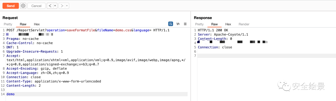 POST /ReportServlet?operation=saveFormatFile&fileName=demo.css&language= HTTP/1.1Host: xxxxxxConnection: loseContent-Type: application/x-www-form-urlencodedContent-Length: 2demo