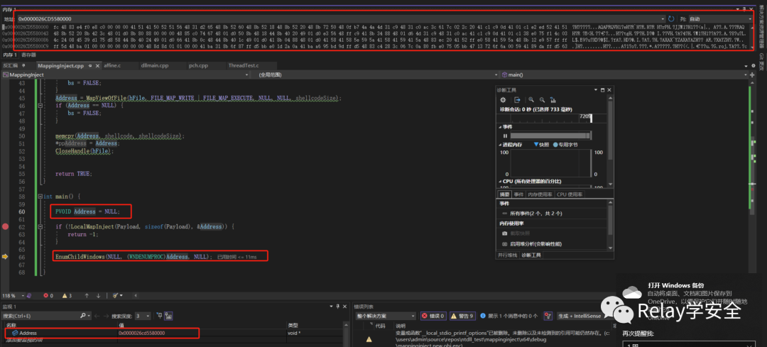 hFile = CreateFileMappingW(INVALID_HANDLE_VALUE, NULL, PAGE_EXECUTE_READWRITE, NULL, shellcodeSize, NULL);创建完成文件映射之后,接下来需要来将文件映射的视图映射到进程的地址空间中。