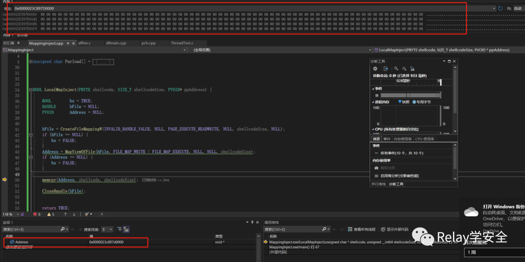 创建完成之后,我们拿到了创建好内存的地址,然后通过memcpy将shellcode复制到创建好的内存地址中。