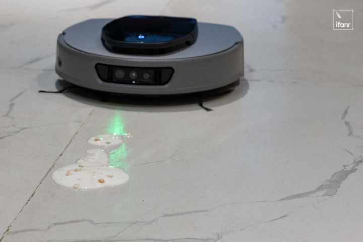 事实上,在工程领域,善用「第一性原理」的产品,总有让人眼前一亮之处。放眼星辰大海,我们会看到可回收火箭,而回到自家门前,其实清洁家电也可以有遵循「第一性原理」的产品创新。1996 年,世界上第一台量产型扫地机器人诞生,这是人类史上最早的清洁家电——它被命名为「三叶虫」(Electrolux Trilobite),是由瑞典家电巨头伊莱克斯研发制造的。外国人将这个品类定义为「Vacuum Robot」,直译过来就是吸尘器机器人。作为吸尘器的升级版,它可以自己钻到桌子和床底下来清扫地面。但对于「以水为净」的中国用户而言,地面清洁其实囊括了扫地和拖地两件事,对清洁和卫生有着特殊理解和重视的中国家庭,对地面清洁的需求,是必须要有「水」的加入。有了水的加入,扫拖一体的机器人产品应运而生,在扫地的同时,也能完成拖地,看起来是一举两得且轻松愉快。但正因为有了水的加入,机器人就不可避免地涉及到加注清水和清倒污水的「上下水」问题。除了发霉发臭,最大的问题还是容易滋养蚊虫细菌,污染家庭环境。扫地机器人诞生的初衷,是为了解放人类双手,提高清洁效率,但更多的时候,清洁问题只是被后置了,效率并不见得有多大的提升。可以说「上下水」问题,是扫拖机器人们难以抵达的「最后一公里」。当我们重新审视地面清洁的本质,其实就是将脏污从地面交换到清水中,然后再把污水处理掉。我们要解决的,是清水从何而来,以及污水要从何而去的问题。既然如此,机器人自己处理污水,还能自己制水,岂不美哉?这就是以「第一性原理」的方法论对清洁家电品类进行重新思考。3i 智能净地站提出的终极解决方案,就是创新性地内建一套 「净水循环系统」,让用户彻底解放双手。有了「净水循环系统」之后,基站的安装就无需考虑上下水的问题——这也是许多家庭的痛点,毕竟不是每个房子都有合适的上下水通道,而且管道改装也是一笔不小的支出。相比之下,3i 智能净地站可以放在家里的任意角落,一站式解决。除此之外,最大的好处是:只需要给基站的清水箱注入一次纯净水就够了,后续依靠「净水循环」就可以实现终生不加清水,不倒污水。「净水循环系统」中的「污水净化中心」,具备「消毒」和「制水」两大功能。机器人完成扫拖工作之后,滚筒清扫和自清洁产生的污水,都会被回收至基站内嵌的污水箱当中。这时候,基站里的污水会被加热至 90℃ 的微沸状态,充分消毒之后通过蒸馏系统冷凝为纯净水,并传送至清水箱实现净水循环。与此同时,基站还会对清水箱中的水量进行判断,如果水量不够,则会自动通过空气萃取水分。这个「凭空而来」的萃水操作有点像升级版的抽湿机,直接将空气抽进机身并通过冷凝系统获取水分,再经过银离子消毒处理,获得净水,最后补充到清水箱当中。这套「净水循环系统」实现了水箱消毒和制水的自给自足,扫地机器人的「最后一公里」也就迎刃而解。扫地机器人有着最主要的三个品质:主动、高效、聪明。主动是扫地机器人的本分,高效则有着创新的设计兜底,3i 的智能净地站好不好用,关键就在于聪不聪明。六核 CPU \ 四核 GPU \ 4T 高算力 NPU 智能 AI 芯片四滚轮配置(在双边扫和中扫滚轮以外,还罕见地配备了一个拖地滚筒)首先是建图,3i 智能净地站的扫拖机器人配备了 200 万像素的 RGB 摄像头,双线激光等传感器,除了具备空间感知能力,还能通过图像识别来在地图上还原家具场景。机器人在底部配备了「绿眼」模块,通过中波段绿激光的向前照射,在照射到液体、污渍、固体颗粒物、灰尘等不同的脏污时,会形成不同的反射光斑。机器人正面的高精摄像头可以捕捉这些光斑图像,再配合 AI 深度学习算法,从而能识别 52 种脏污及常见物体,并制定针对性清扫策略,以提高清洁效率——比较脏的地方,还会来回拖几遍,提高洁净度。机器人扫拖的轨迹也是按照「弓字形」的轨迹来实现区域覆盖,在效率和覆盖面上取得了平衡,后置滚筒也能减少覆盖死角。扫拖机器人在工作的时候也能识别地上的一些常见障碍物,例如站立的人类、放在地上的袜子、鞋子等等,机器人在识别之后会主动进行避让,这一点还是比较聪明的。透过玻璃地板可以看到,3i 机器人是可以用滚刷来清洁液体脏污的,被吸附的污水也会被刮至机器人的污水箱中,让滚刷保持相对洁净的状态,然后继续工作。而连通中扫的无刷风机最大可提供 8000Pa 的吸力,无论是面对常见的地面尘屑、毛发、零食,还是猫粮和猫砂等垃圾统统都能吸走。为了测试一下机器人的清洁能力,我们为它准备了一些相对常见的脏污垃圾,分别涵盖了干垃圾、湿垃圾甚至是干湿混合的垃圾。广东人家里总免不了有几株盆栽,先从家里盆栽的枯枝落叶开始扫起,面对细碎的干垃圾,一气呵成,路过无痕:难度轻微升级,随手洒落且带着油渍的碎薯片也不在话下,都可以顺利带走并拖干净地面:既然如此,咱们难度直接拉满,直接让 3i 来面对酸奶和谷物的混合物。结果依然是能够一把带走,顺带将地面擦干净,这点确实让我们感到喜出望外。得益于滚刷结构,3i 智能净地站也可以实现类洗地机那样的扫拖功能,所以同为「地狱难度」的番茄酱,其实 3i 机器人也能扫拖得很干净,整体来看它的清洁效果足以让我们感到惊艳。这意味着,家中地面常见的多种垃圾类型,它都能够清洁干净。我们常说,成