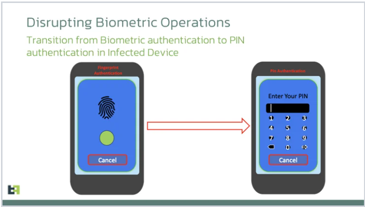 研究报告中写道,Chameleon木马变种新增了几个危险的特性,比如,它能够中断目标设备上的生物识别操作(例如指纹、人脸识别),强制将其切换到PIN码或图案验证,使其为木马所捕获,后续木马可以使用这些信息来解锁设备。