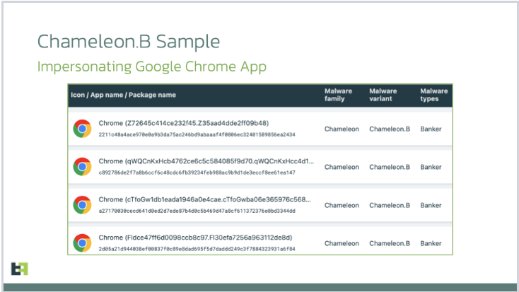 ThreatFabric报告称,Chameleon木马通过暗网的一个Zombinder应用共享服务来伪装成谷歌Chrome应用程序传播。Zombinder会将恶意软件“粘合”到合法的安卓应用程序上,使得受害者能够正常使用他们打算安装的应用程序的全部功能,以避免受害者怀疑危险代码在后台运行。Zombinder服务宣称其恶意捆绑包在运行时无法被检测到,能够绕过谷歌的安全警报,并且能够躲避受感染设备上运行的任何反病毒产品。