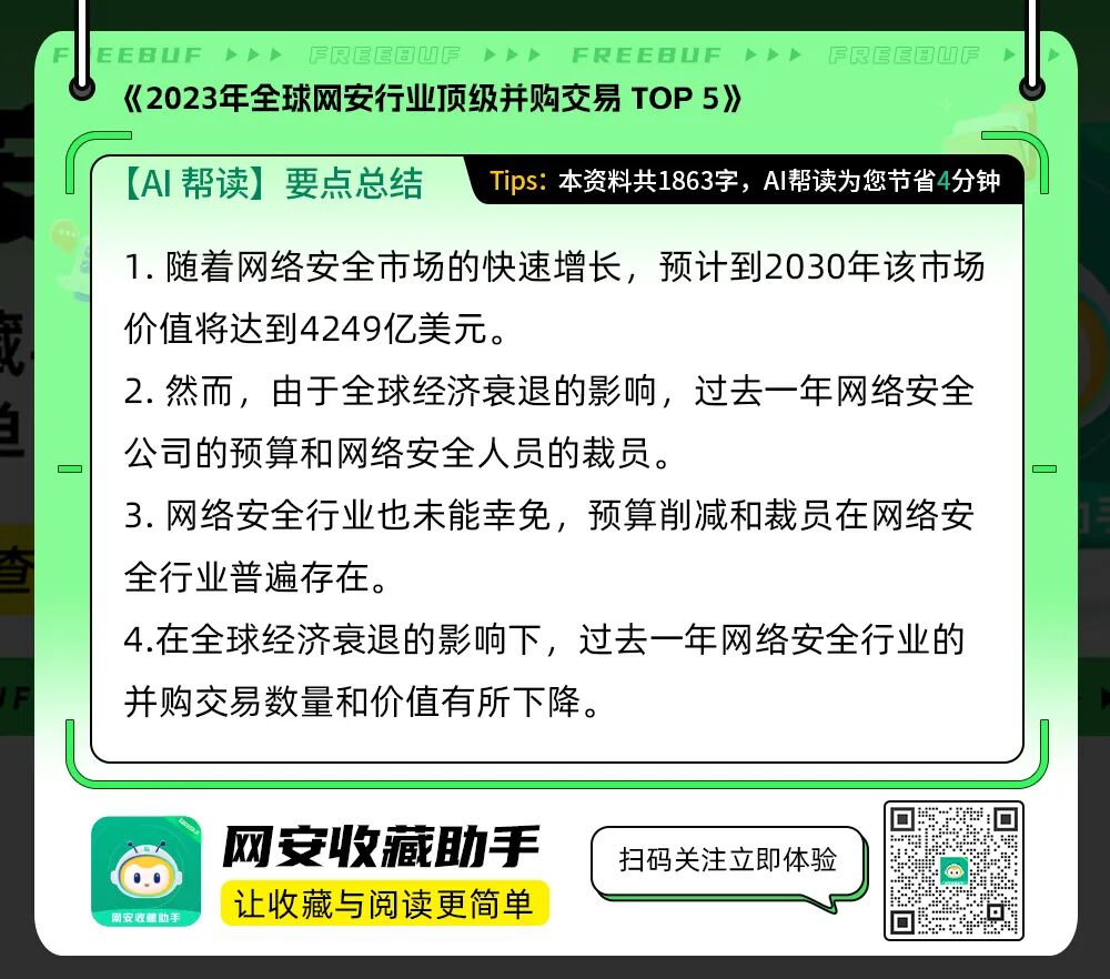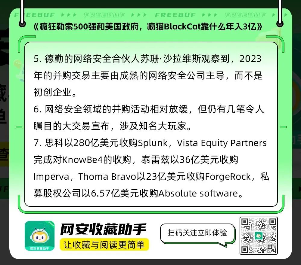 德勤的网络安全合伙人苏珊·沙拉维也观察到了这种“安全第一”的做法,她指出,2023年的并购交易主要由成熟的网络安全公司主导,而不是初创企业。