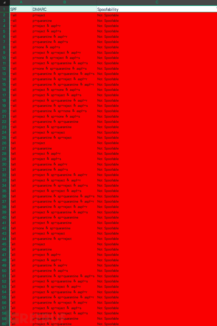 该工具基于一个域名欺骗可行性表实现其功能,表格中列出了每个相关的SPF和DMARC配置,将它们组合起来,然后再进行大量的域名数据采集: