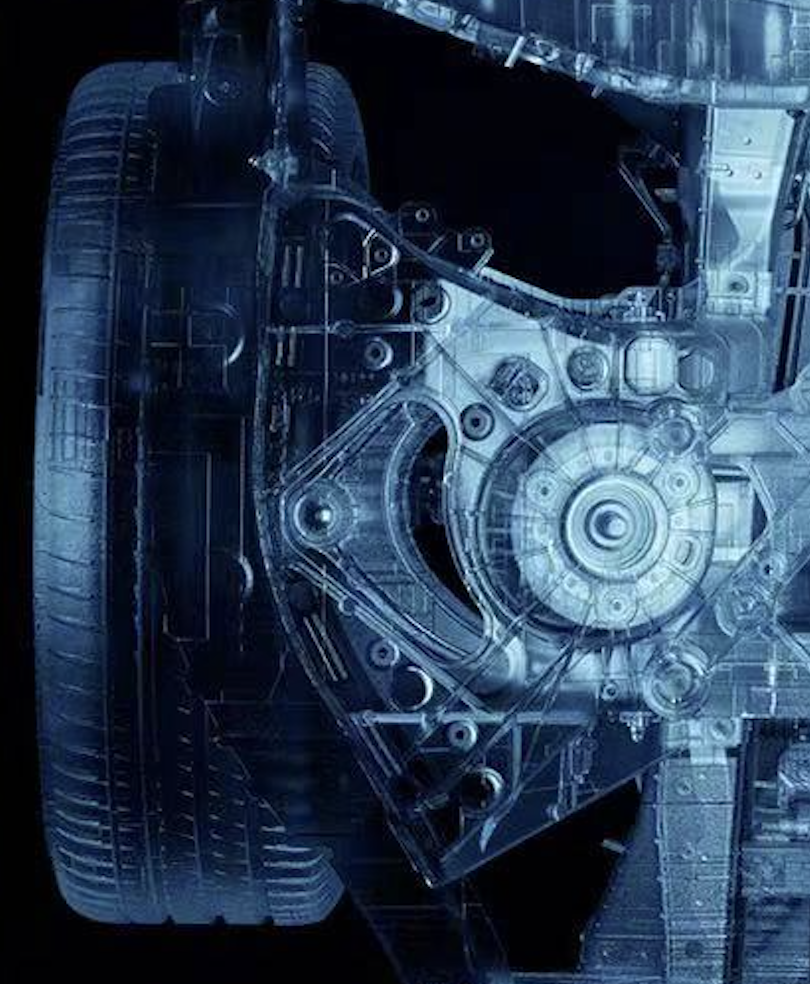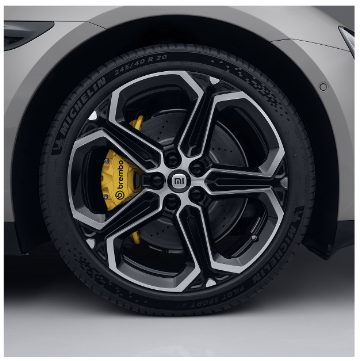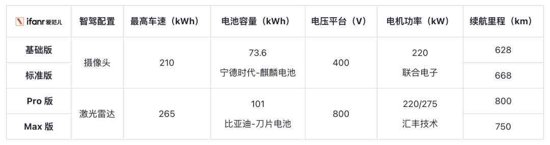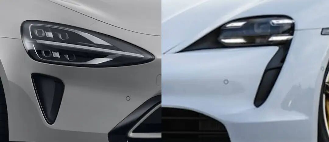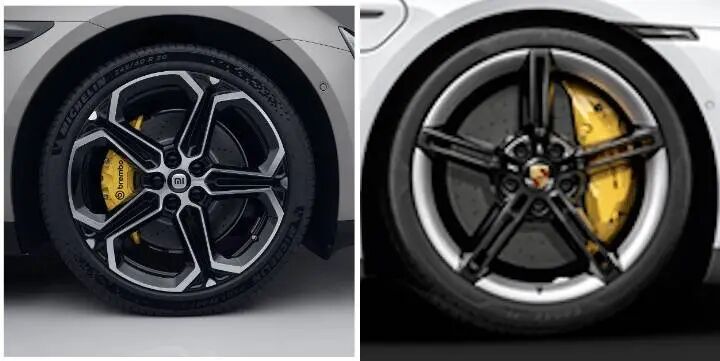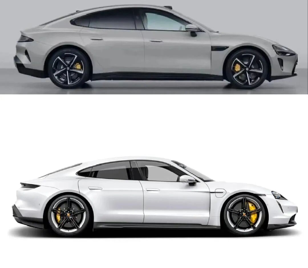 不管是学习的开始,还是成品的目标,雷军始终将「保时捷」作为榜样,因此小米的第一辆车才会处处彰显 Porsche 的影子。如果我们把国产新能源的在售旗舰轿车放到一起,其实都能看出这种相似性,但唯独 SU7 会「更得真传」,主要集中在两者的几处细节。首先是前脸的日间行车灯,Taycan 当年一改保时捷经典的「蛙眼」车灯,转而采用了全新设计的矩阵大灯,而米汽车和其一样,均采用了扁平的「四点式 LED」。来到侧边,两条顺滑的腰线和顶部独具特色的流线型,使得两辆车的整体轮廓有些重合。另外,SU7 和 Taycan 同为「纯平侧窗」,这也是大部分新能源都会采用的设计,有些许差别的是 SU7 的 B 柱上多了一个挖空,放大后可以看出是一个摄像头,总共算下来小米车周围的摄像头数量大概有 10 个,全车 360 和透明底盘应该都会标配了。亮黄色的卡钳和五幅轮毂(都是选装项),包括两者都采用了不常见的「半隐藏式门把手」,都会让人在凝视小米汽车时,产生「一眼 Taycan」的感觉。从多日来全网陆续曝光的 SU7 路试影像不难看出,小米造的第一辆车,是真的挺好看,在向优秀前辈学习的同时,也保留了诸多自身特色。上面的 SU7 样图,最先公布于工信部第 377 批《道路机动车辆生产企业及产品公告》,其中有两份详情文件,介绍了该车的外观和参数。整车尺寸(mm):长-4997,宽-1963;高-1455从基本参数可以看出,车长 4997mm、轴距 3000mm 的小米 SU7 ,比特斯拉 model3 更大,达到了奔驰 E 和宝马新 5 系的尺寸,符合「C 级轿车」的定位。我们统计了两份文件中的差异数据,推断出小米汽车的四个版本。其中,激光雷达和电池容量是区分车辆配置的重要依据。SU7 基础版和标准版搭载了比亚迪磷酸铁锂「刀片电池」,车顶没有激光雷达,也没有在文件中看到尾翼的展示图。Pro 和 Max 版配备宁德时代三元锂「麒麟电池」,标配激光雷达和电动尾翼,并且这两款都是双电机的版本,前后输出功率分别为 220kW/275kW,预估零百加速 4.2s。在选装件上,SU7 也像保时捷一样,有很多定制的空间,比如车标和车尾字标有「亮色」和「黑色」,和蔚来选配的「Sun 套件」与「Moon 套件」极为相似,参考蔚来 Moon 主题的价格 4500 元,就看小米能不能把价格打下来了。小米汽车官微 25 号发出的这张海报,算第一次官方爆料,像 X 光一样的俯视图细节非常丰富,因此引来了一大波网上的专业分析。先看底盘,SU7 前悬架采用了「双叉臂+空气悬架」的组合悬架总成。双叉臂结构,对应了它本身运动操控的定位,与双叉臂直接连接的两个显眼圆桶,应该是放置空气弹簧的气包部件。细看双叉臂直接连接的轮胎,从其花纹走向判断,SU7 标配米其林 PSEV ,是为电车而生的操控胎,工信部文件也给出了详细的前后胎参数: