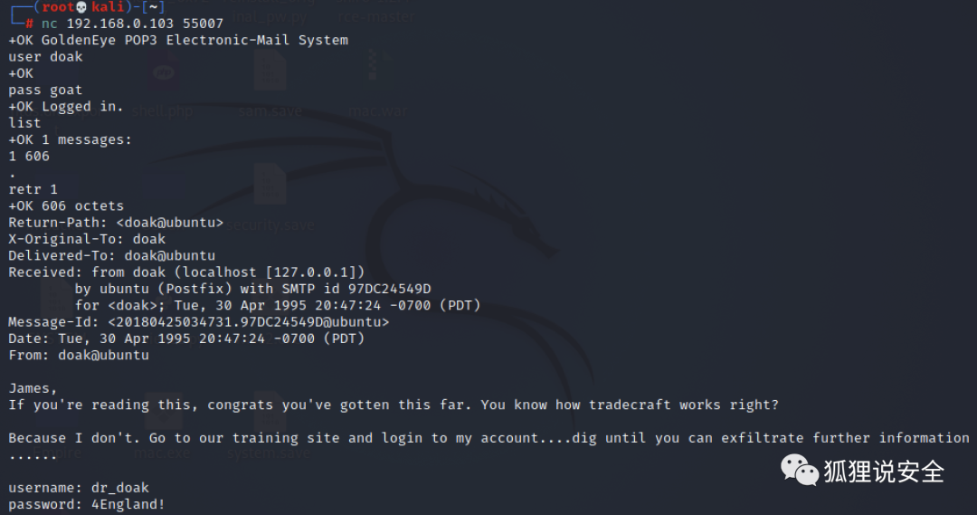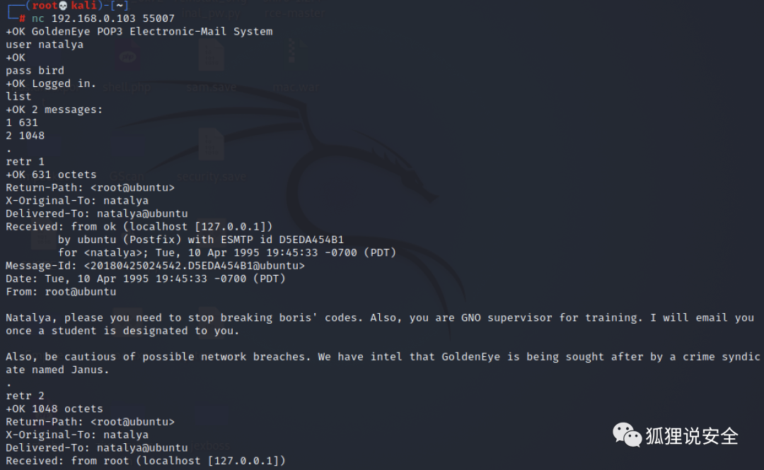 ## 第一封Return-Path: <[email protected]>X-Original-To: borisDelivered-To: boris@ubuntuReceived: from ok (localhost [127.0.0.1]) by ubuntu (Postfix) with SMTP id D9E47454B1 for <boris>; Tue, 2 Apr 1990 19:22:14 -0700 (PDT)Message-Id: <20180425022326.D9E47454B1@ubuntu>Date: Tue, 2 Apr 1990 19:22:14 -0700 (PDT)From: [email protected], this is admin. You can electronically communicate to co-workers and students here. I'm not going to scan emails for security risks because I trust you and the other admins here.## 第二封Return-Path: <natalya@ubuntu>X-Original-To: borisDelivered-To: boris@ubuntuReceived: from ok (localhost [127.0.0.1]) by ubuntu (Postfix) with ESMTP id C3F2B454B1 for <boris>; Tue, 21 Apr 1995 19:42:35 -0700 (PDT)Message-Id: <20180425024249.C3F2B454B1@ubuntu>Date: Tue, 21 Apr 1995 19:42:35 -0700 (PDT)From: natalya@ubuntuBoris, I can break your codes!## 第三封Return-Path: <[email protected]>X-Original-To: borisDelivered-To: boris@ubuntuReceived: from janus (localhost [127.0.0.1]) by ubuntu (Postfix) with ESMTP id 4B9F4454B1 for <boris>; Wed, 22 Apr 1995 19:51:48 -0700 (PDT)Message-Id: <20180425025235.4B9F4454B1@ubuntu>Date: Wed, 22 Apr 1995 19:51:48 -0700 (PDT)From: [email protected],Your cooperation with our syndicate will pay off big. Attached are the final access codes for GoldenEye. Place them in a hidden file within the root directory of this server then remove from this email. There can only be one set of these acces codes, and we need to secure them for the final execution. If they are retrieved and captured our plan will crash and burn!Once Xenia gets access to the training site and becomes familiar with the GoldenEye Terminal codes we will push to our final stages....PS - Keep security tight or we will be compromised.