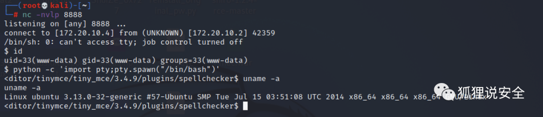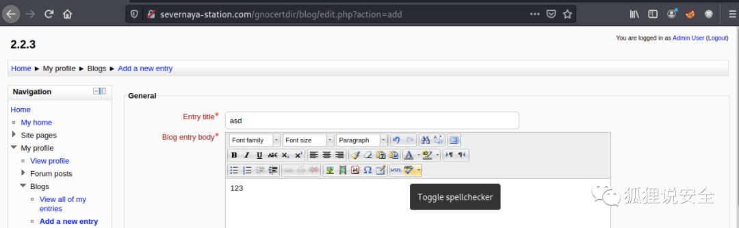 nc -nvlp 8888在Home》My profile》Blogs》Add a new entry中新建博客,点击Toggle Spellchecker后成功拿到反弹shell